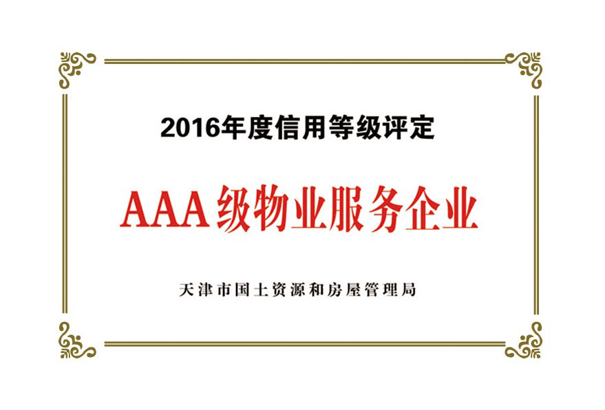 公司目前被授予:中國保安協會理事單位、物業(yè)管理綜合實力入圍企業(yè)、天津市物業(yè)協會理事單位、天津市保安協會常務理事單位、天津市保潔協會明星企業(yè)、天津市科技小巨人企業(yè)、天津市科技型企業(yè)、天津市物業(yè)管理企業(yè)優(yōu)秀項目經理、企業(yè)信用評價體系AAA級企業(yè)、AAA級誠信經營示范單位、AAA級重合同守信用單位、2017年被天津市工商業(yè)聯合會評為天津市民營企業(yè)促進就業(yè)百強企業(yè)、社會捐贈百強企業(yè)、2018年銷售收入百強企業(yè),2020年被天津市退役軍人事務局評為天津市吸納退役軍人就業(yè)先進單位。